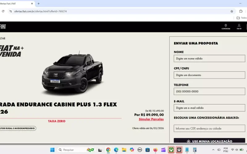 No site Ofertas, a Strada Endurance 2026/2026 está sendo vendida com um desconto de R$ 25.401, saindo por R$ 89.089 para pagamentos à vista de consumidores com CNPJ ou produtores rurais. A oferta é válida para as unidades na cor Preto Vulcano até o dia 4/3/2026, ou enquanto durar o estoque de 20 unidades.