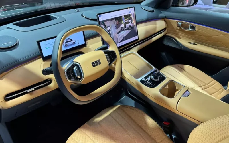 A cabine do Geely EX5 EM-i também apresenta acabamento com materiais sintéticos de alta qualidade e design limpo, seguindo a tendência minimalista da indústria chinesa.